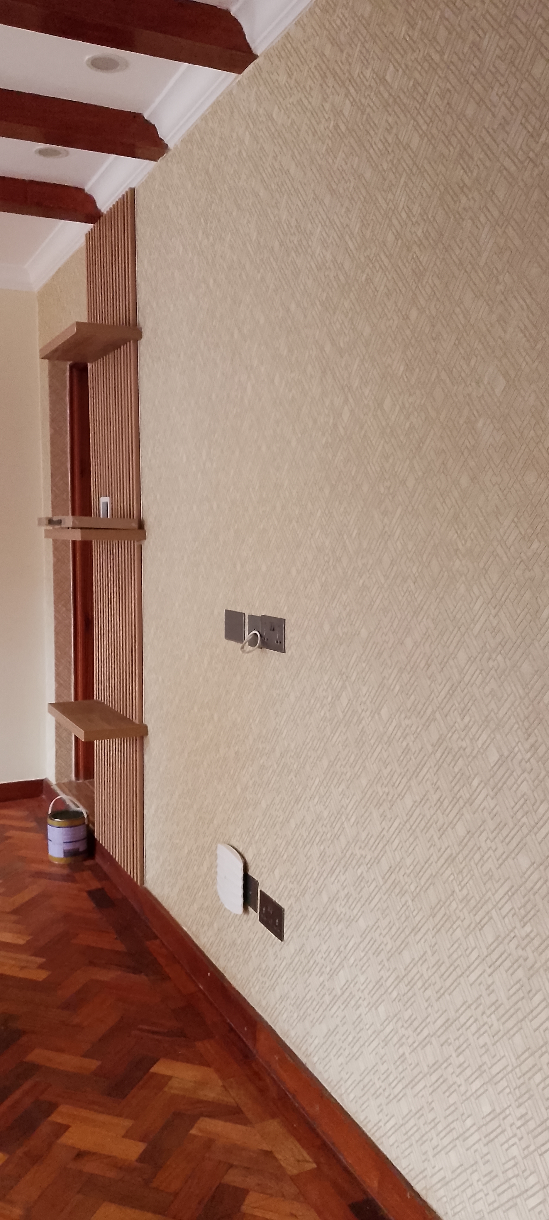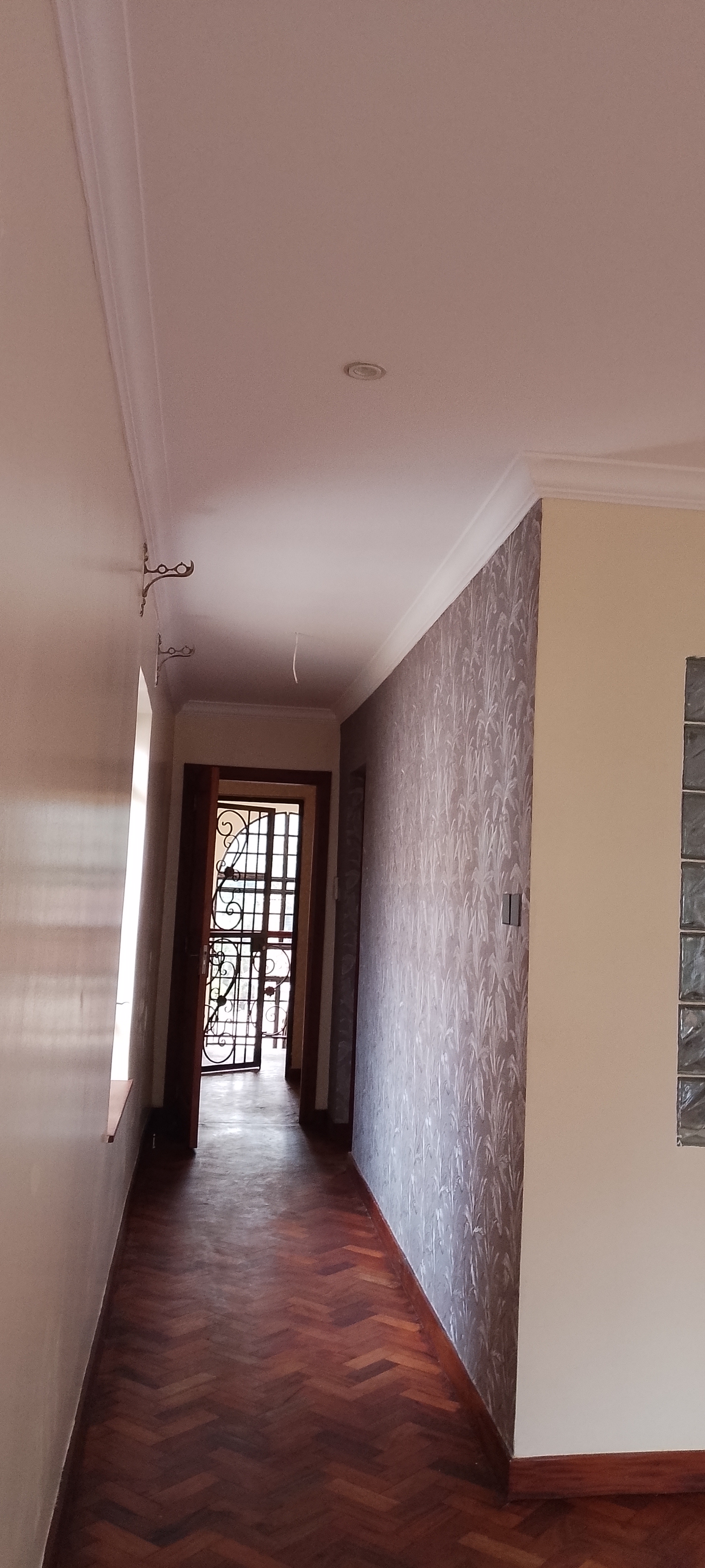 Gypsum ceilings throughout, marble-look tiling, textured wall finishes, and decorative paint.